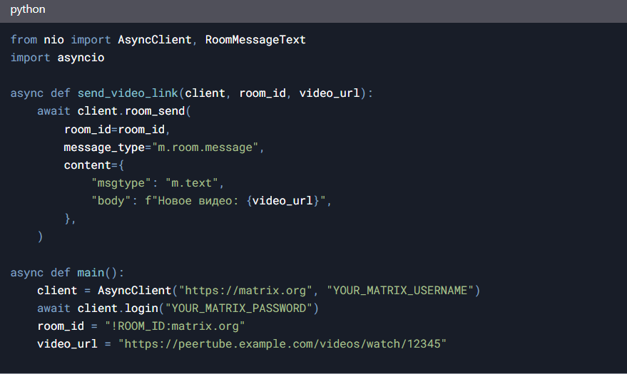 Бот может автоматически публиковать новые видео из PeerTube в определенной комнате Matrix.