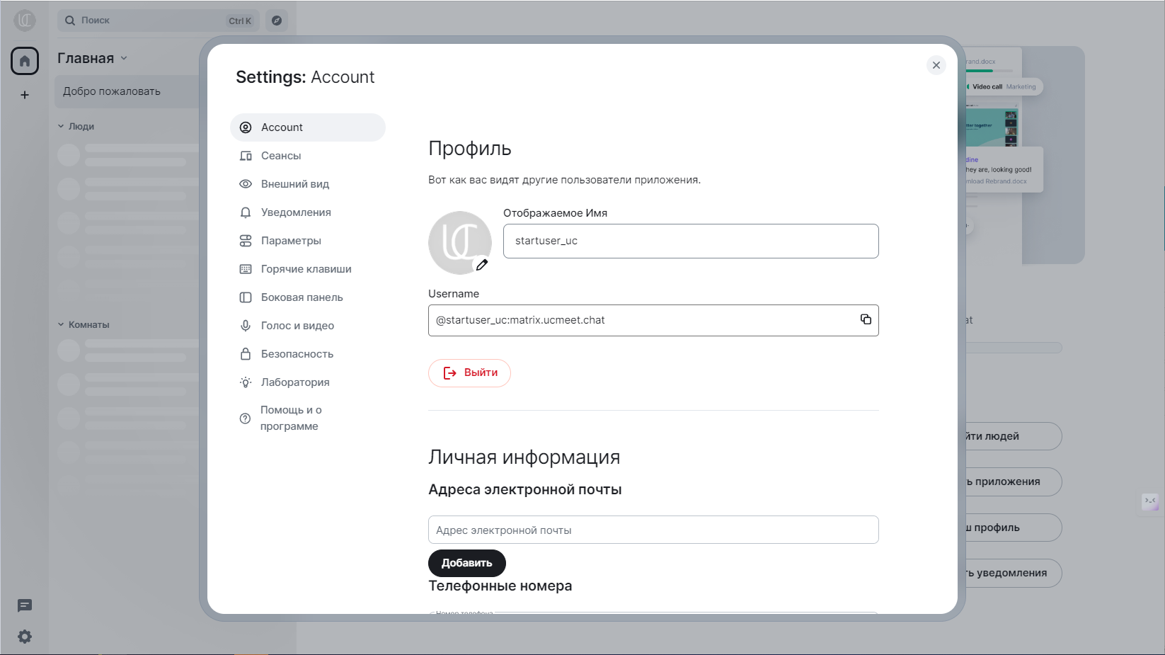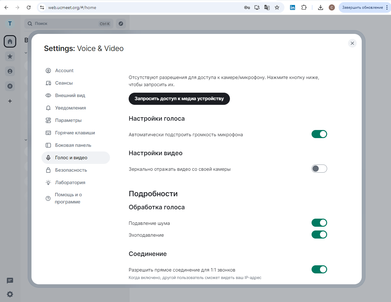 На вкладке «Голос и видео» вы можете разрешить клиентскому UCMeetChat или Element Matrix (если вы его используете) использовать ваши медиа (камера + микрофон), разрешить прямые голосовые/видеозвонки через одноранговые соединения, а в случае видеозвонков — увидеть себя на небольшом изображении: