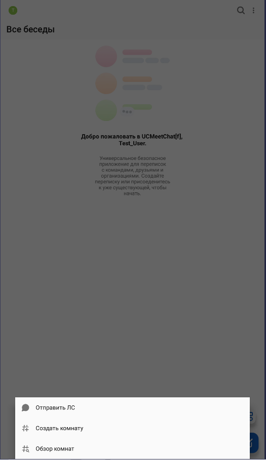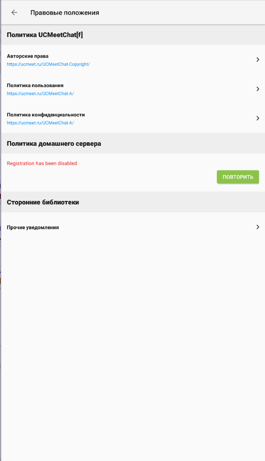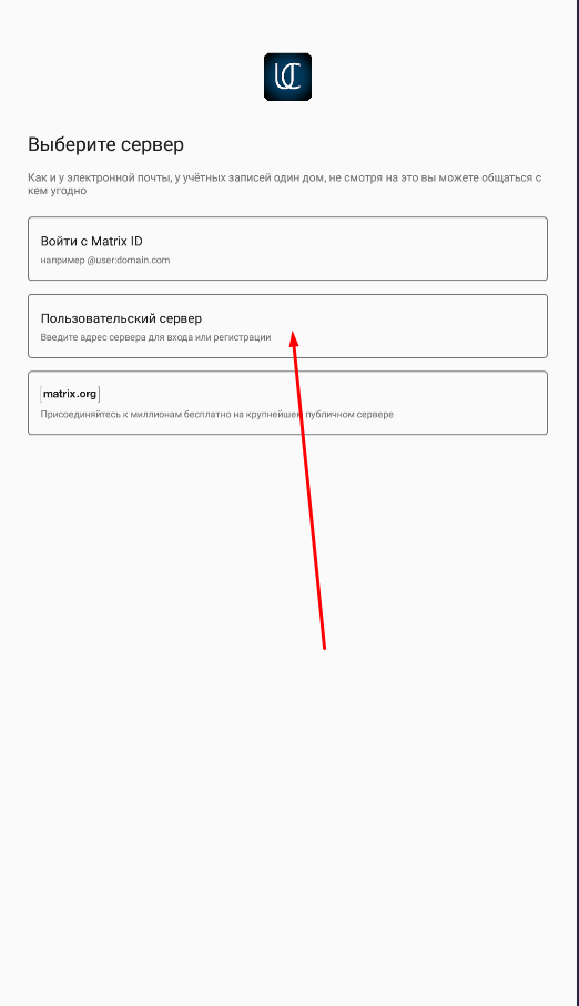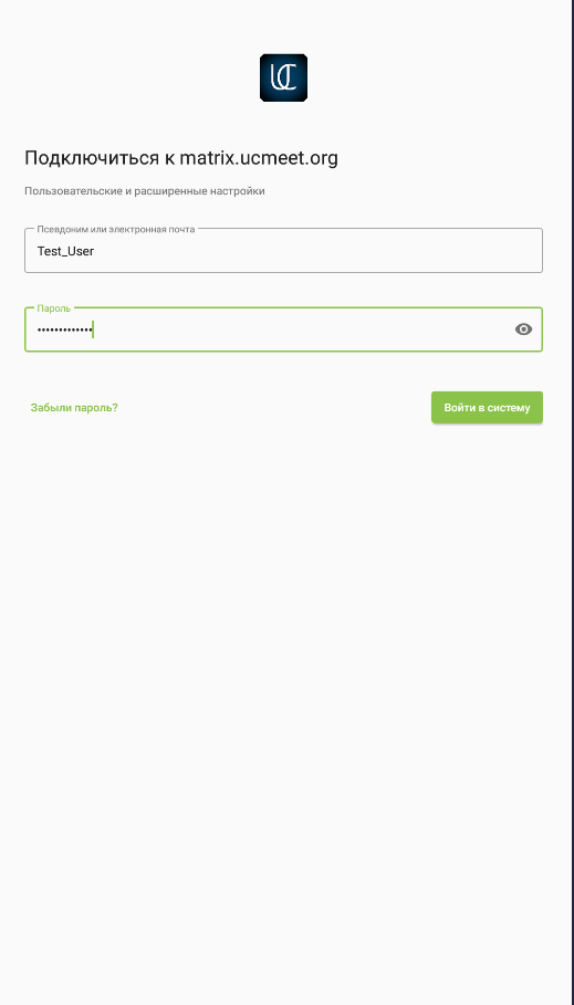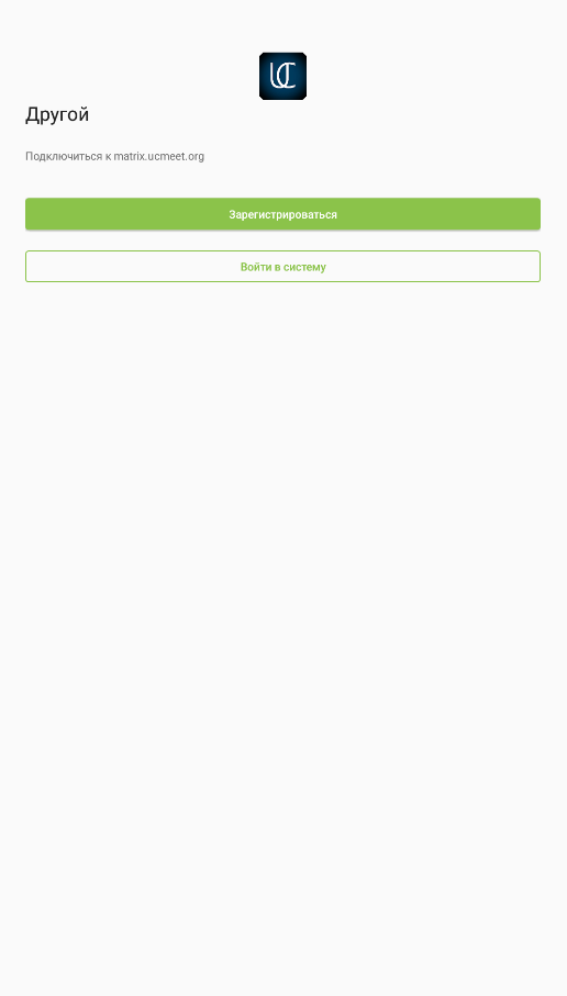 UCMeetChat -универсальное приложение и может работать с любым частным корпоративным сервером, работающем на протоколе Matrix, а также в публичной сети федерации Matrix, поэтому в самом начале нужно определиться с каким сервером мы будем работать. Рассмотрим вариант в закрытом частном сервере: